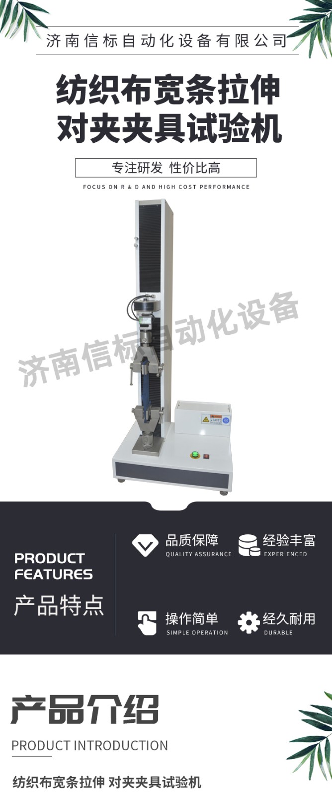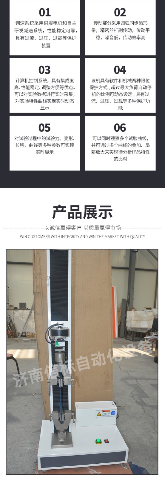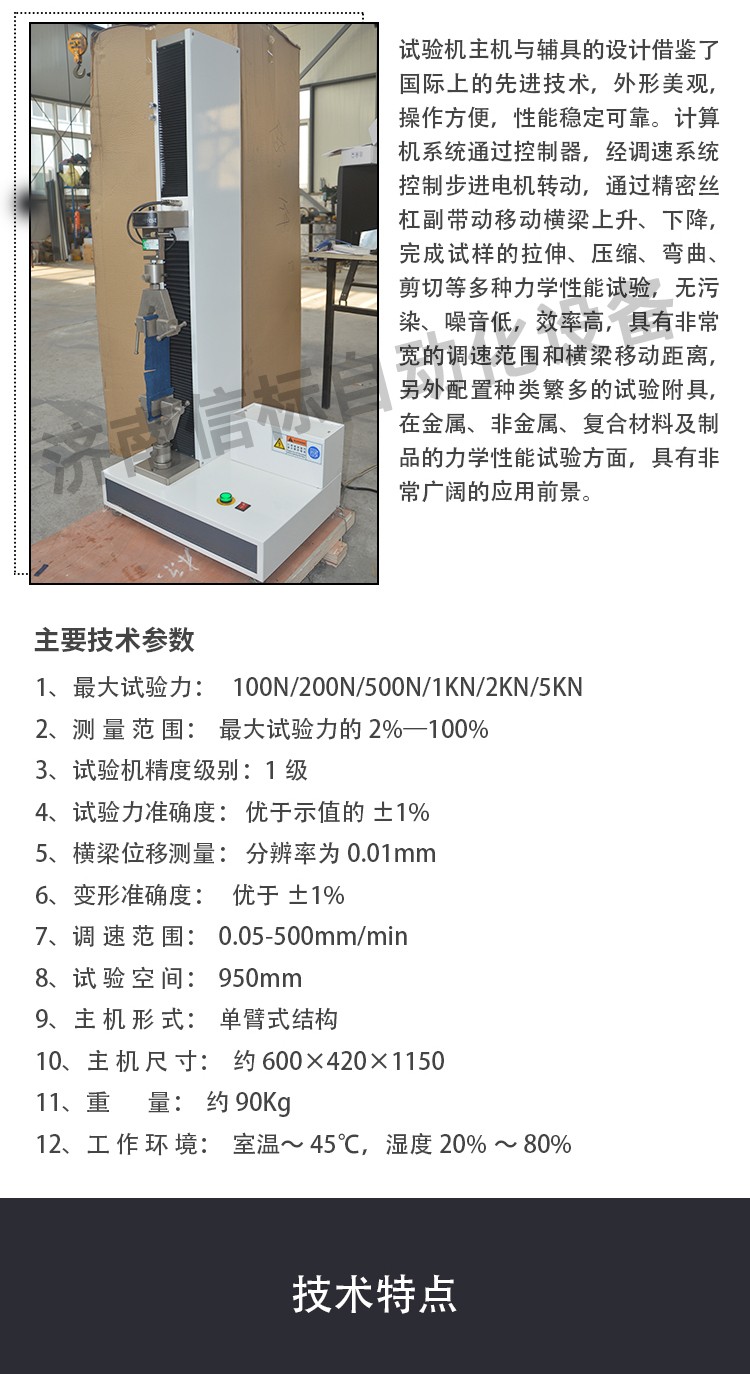 主要功能及特點: 1、主機: 1.1調(diào)速系統(tǒng)采用伺服電機和自主研發(fā)減速系統(tǒng),性能穩(wěn)定可靠,具有過流、過壓、過載等保護裝置。調(diào)速范圍可達0.05~500mm/min。 1.2傳動部分采用圓弧同步齒形帶,精密絲杠副傳動,傳動平穩(wěn),噪音低,傳動效率高。 1.3萬向節(jié)采用十字插銷結(jié)構(gòu),而且具有擺角限制功能,一方面便于試樣夾持,保證試驗同心度,另一方面很好的消除了不規(guī)則試樣對傳感器的影響。 2、控制系統(tǒng)、操作軟件及數(shù)據(jù)處理系統(tǒng) 2.1計算機控制系統(tǒng),具有集成度高、性能穩(wěn)定、調(diào)整方便等優(yōu)點。可以對實驗數(shù)據(jù)進行實時采集,對實驗特性曲線實現(xiàn)實時動態(tài)顯示,試驗數(shù)據(jù)文件能以Access常用數(shù)據(jù)庫或SQLserve大型數(shù)據(jù)庫的方式保存,方便實現(xiàn)客戶的資源共享及網(wǎng)絡(luò)管理,以及用戶的再分析。對于用戶自定義的各種word2000報表,該軟件可輕松實現(xiàn)訪問,解決了不同用戶或同一用戶在不同時期對試驗報表有不同需要的難題。該軟件可處理試驗力、位移、 時間、變形的原始數(shù)據(jù)及由此派生的曲線。 2.2保護功能:該機具有軟件和機械兩種限位保護方式,超過最大負荷自動停機的比例可動態(tài)設(shè)定;具有過流、過壓、過載等多種保護功能。 2.3對于負荷、變形通道可實現(xiàn)自動標示,直觀方便。 2.4批量試驗可實現(xiàn)曲線的分層次顯示,曲線自動跟隨。 2.5該軟件可實現(xiàn)用戶自定義的速度設(shè)定,速度的計算機調(diào)整。還可實現(xiàn)高精度的速度標定,隨時調(diào)整速度檔位和編碼。